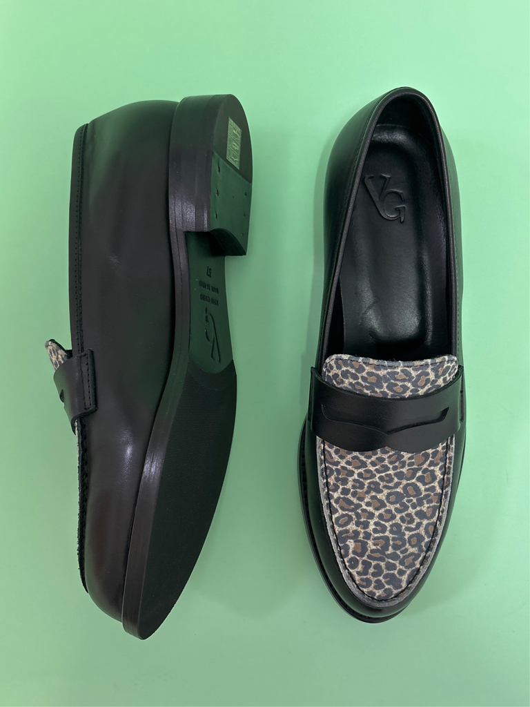 Mocassini College con tomaia e mascherina in liscia nera e vaschetta in pelle scamosciata con stampa maculata.